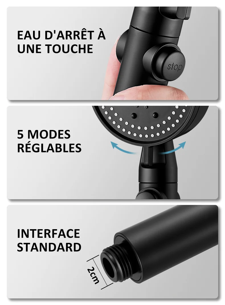 Cette pomme de douche est livrée avec 5 modes: impulsion/pluie/mixte/Massage/pistolet de pulvérisation, chaque mode apporte la meilleure expérience de douche; l'eau est fine, dense et uniforme, ce qui rend la peau douce et confortable.